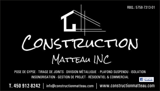 Quels que soient vos projets ou besoins en terme de produits et services, vous trouverez en CONSTRUCTION MATTEAU INC un partenaire de confiance reconnu pour son approche professionnelle et son efficacité. Nous sommes des experts en Entrepreneurs généraux COMMERCIAL, PUBLIC, INDUSTRIEL, Systèmes Intérieurs (Gypse Pose), .